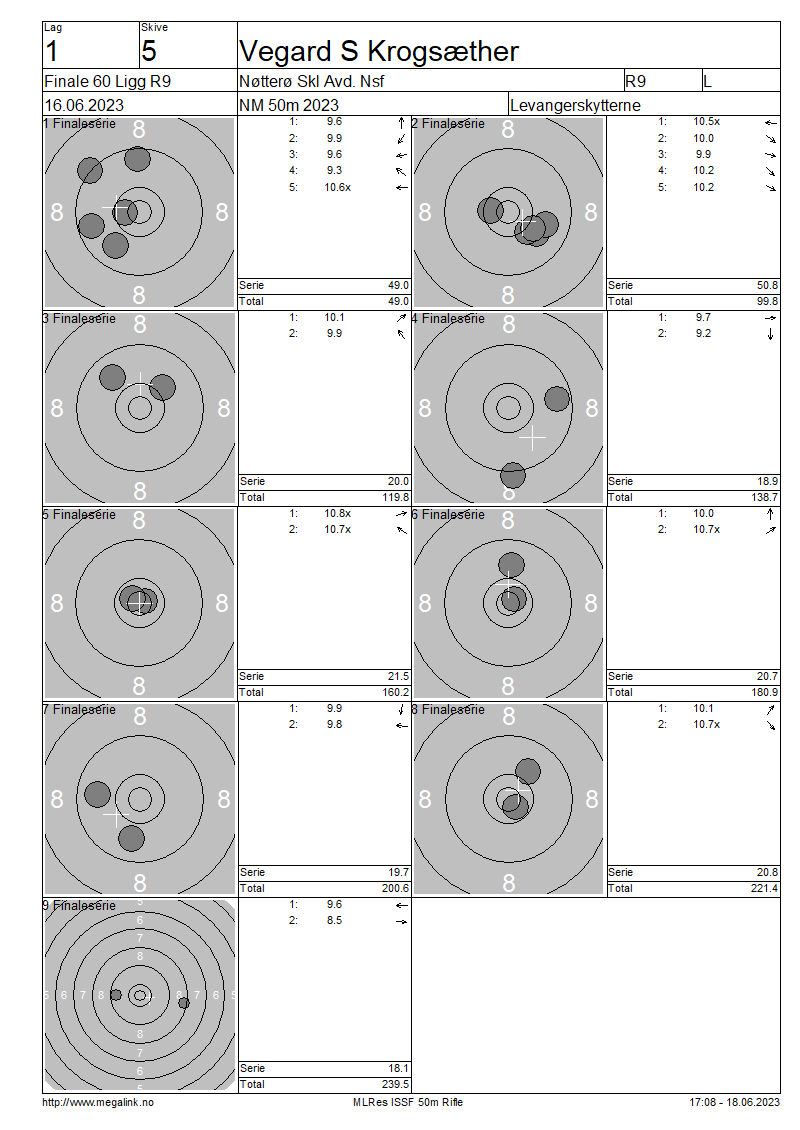 | 1 | E | 57 | KROGSÆTHER Vegard S | Nøtterø Skl Avd. Nsf | 49.0 | 50.8 | 20.0 | 18.9 | 21.5 | 20.7 | 19.7 | 20.8 | 18.1 | 239.5 | |||||||||||||||||||||||||||||||||||
