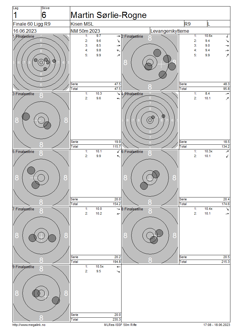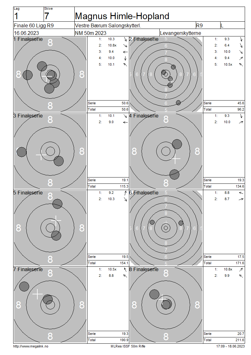 | 3 | G | 39 | HIMLE-HOPLAND Magnus | Vestre Bærum Salongskytterl. | 50.6 | 45.6 | 19.1 | 19.3 | 19.5 | 17.5 | 19.3 | 20.7 | 211.6 | ||||||||||||||||||||||||||||||||||||